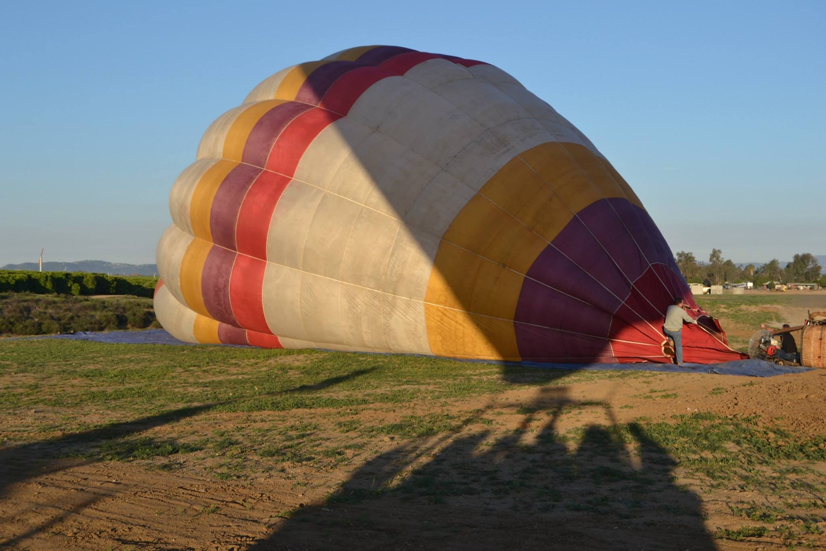 Watch the envelope come to life. A fan blows cold air in, then the burner heats it. The balloon stands up in about 15 minutes.